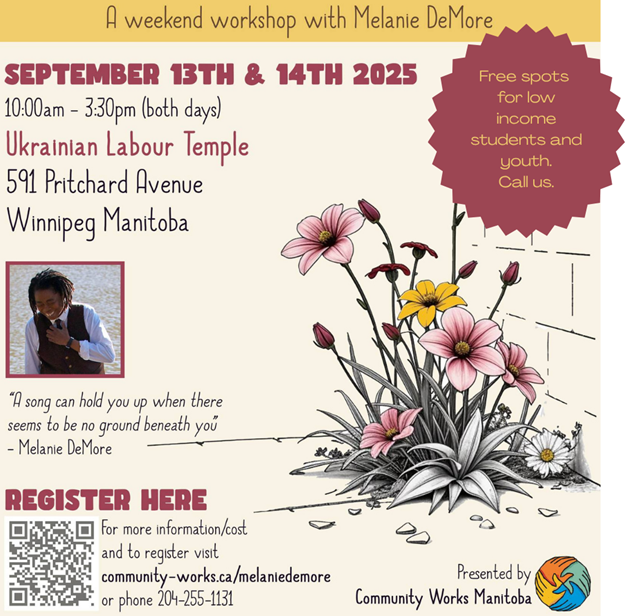 Melanie DeMore, internationally known vocal activist, is coming to Winnipeg to lead a 2-day singing workshop at the Ukrainian Labour Temple on the weekend of Sept. 13-14. Melanie, a 3-time Grammy nominee, composer, and choral conductor, excels at bringing people together in these divisive times to connect through the joy of singing. For details and registration go to www.community-works.ca. Music for Life (Winnipeg) is offering a number of FREE SPOTS in the workshop for low income youth/students aged 10-29. Call 204-255-1131 for information.