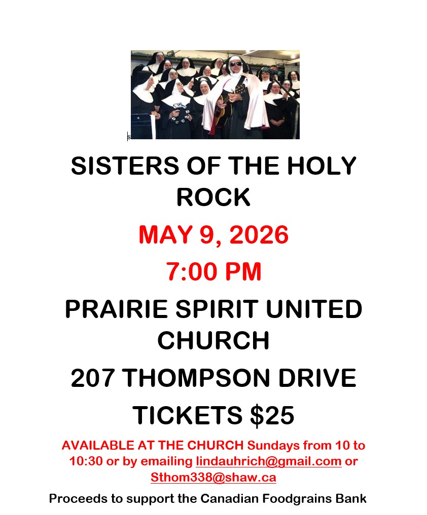 Prairie Spirit United Church is hosting Sisters of the Holy Rock on Saturday May 9, 2026. Suitable for all ages. Wheelchair accessible. Tickets are $25. Call the church office at […]