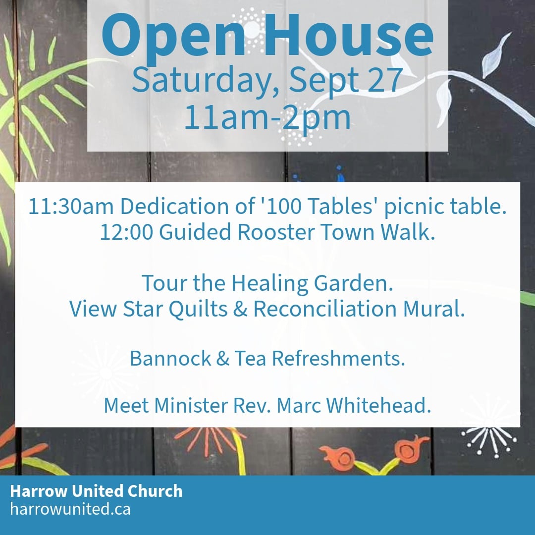 Open House includes dedication of our recently decorated “100 tables” picnic table, a chance for a guided Rooster Town walk, learn about plants in the Healing Garden, view the Indigenous Reconciliation mural and Star quilts and enjoy some tea and bannock while meeting some of our congregation members.